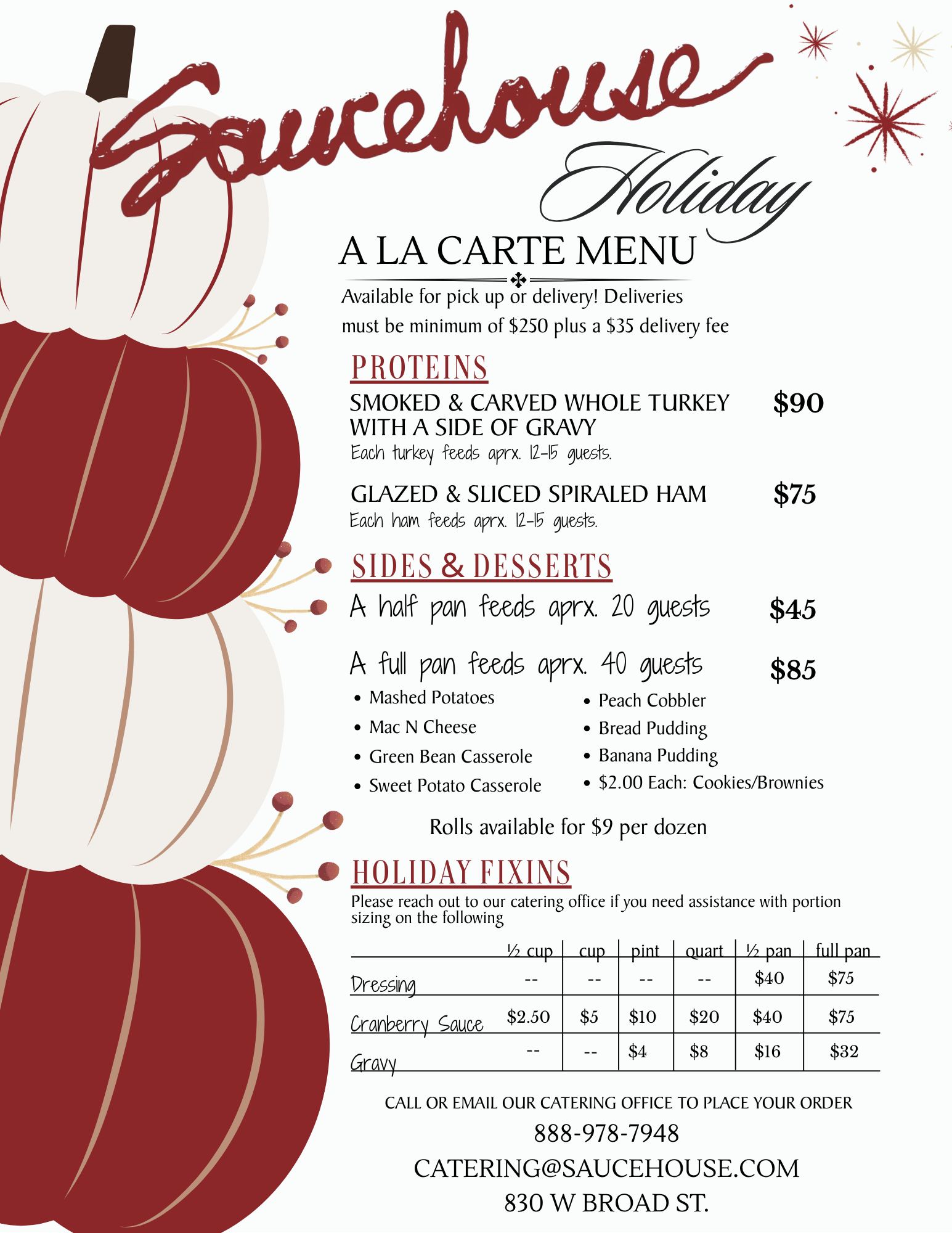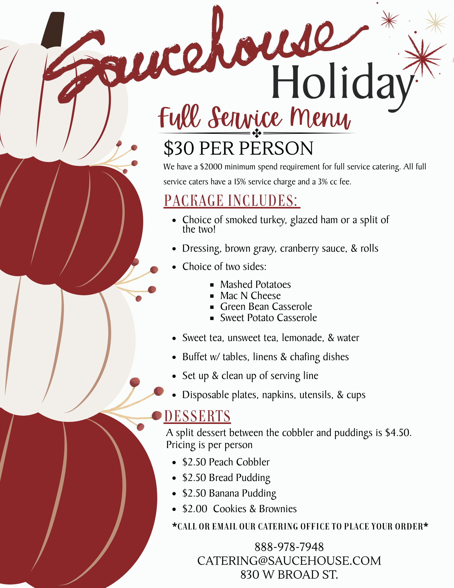 Holiday catering is available November 1st through December 14th. Please note that all Thanksgiving catering orders need to be placed by Friday November 21st for a Tuesday November 25th pick up or delivery date. All items intended for consumption on Thanksgiving day will be prepared cold with reheating instructions.